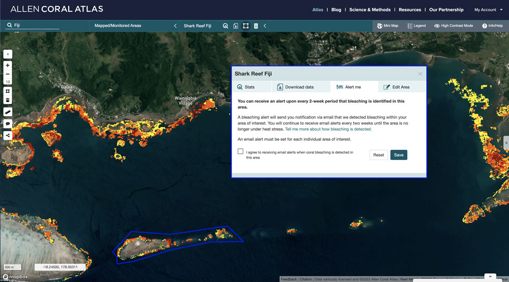 The Allen Coral Atlas partnership uses high-resolution satellite imagery (Planet Dove), machine learning, and field data to map and monitor the world’s coral reefs at unprecedented global coverage. The Atlas provides the new dynamic “Reef Threats” monitoring technology, along with the first comprehensive map of benthic habitats and reef geomorphology. Reef Threats was developed by Arizona State University’s (ASU) Center for Global Discovery and Conservation Science and provides tracking of the location, extent, and severity of potential coral reef bleaching and changes in ocean water turbidity worldwide. The Atlas also has a new bleaching alert system available for marine regions of the world (economic exclusive zones for each country),  marine protected areas, or specific areas of interest. The monitoring system provides observation of potential coral bleaching in three levels of severity (low, moderate, severe) at 10m resolution, based on Sentinel-2 satellite monitoring and incorporating NOAA Coral Reef Watch product data. Sign up for bleaching alerts here!
