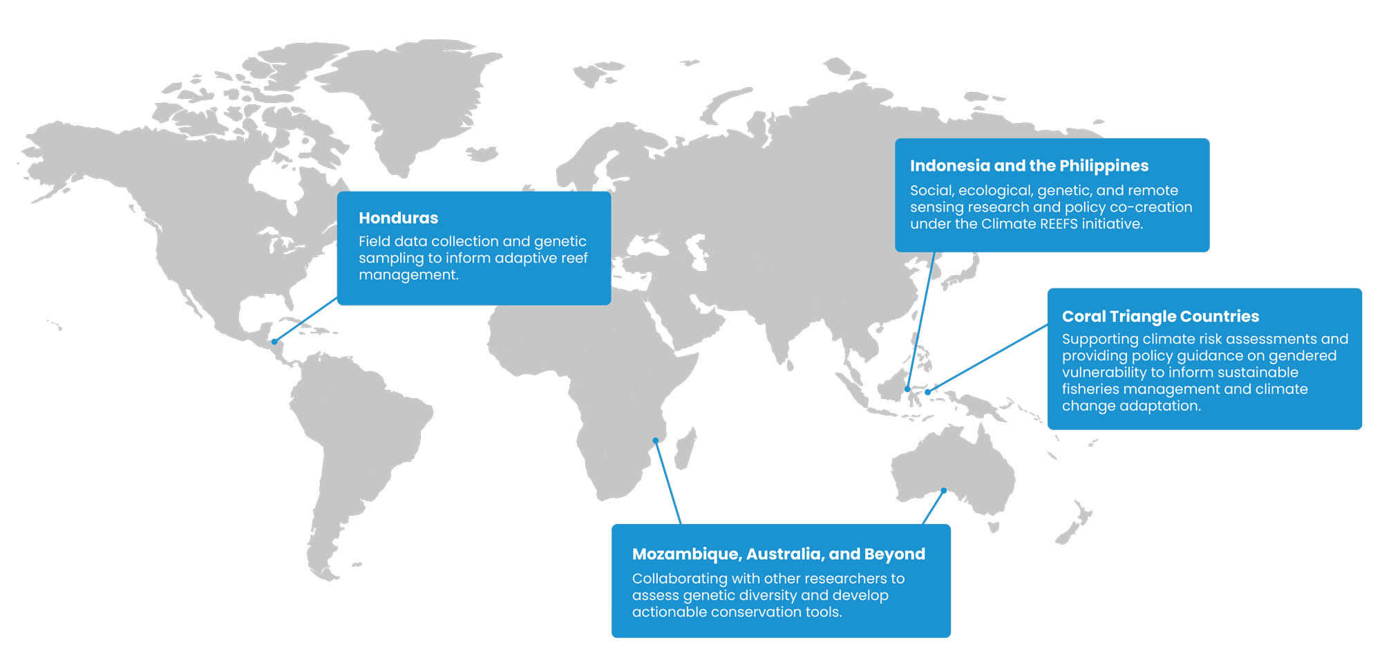 We collaborate with global partners to integrate science into conservation policy. From contributing to a framework to enhance the Mesoamerican Reef’s resilience against climate impacts, to supporting marine spatial planning in the Coral Triangle, we ensure that our research shapes impactful solutions on a global scale.