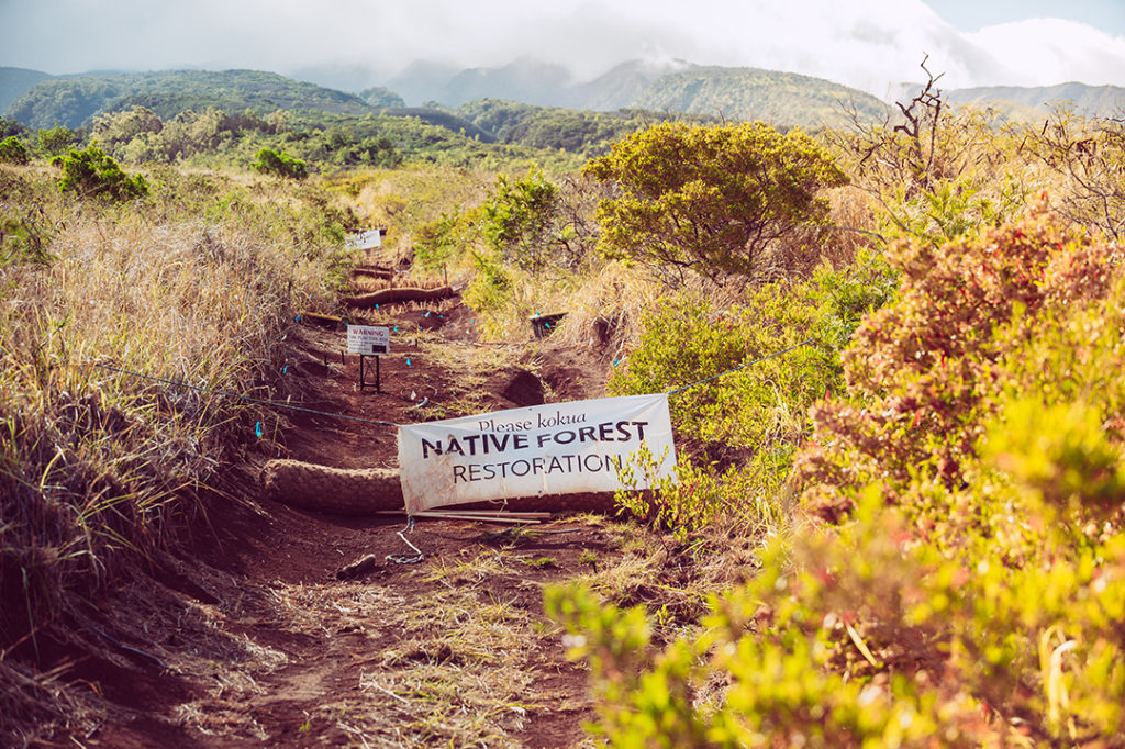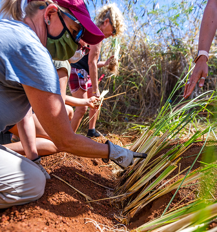 Toward the top of the mountain and in the midslope region, we use native plants—and over 100 supportive volunteers—to restore the degraded landscapes and trap the sediment before it has a chance to runoff into the ocean. We’re restoring the mauka (mountainside) with native plants like pili grass and natural materials like coconut coirs to slow the runoff, trap the sediment, and absorb the nutrients.
