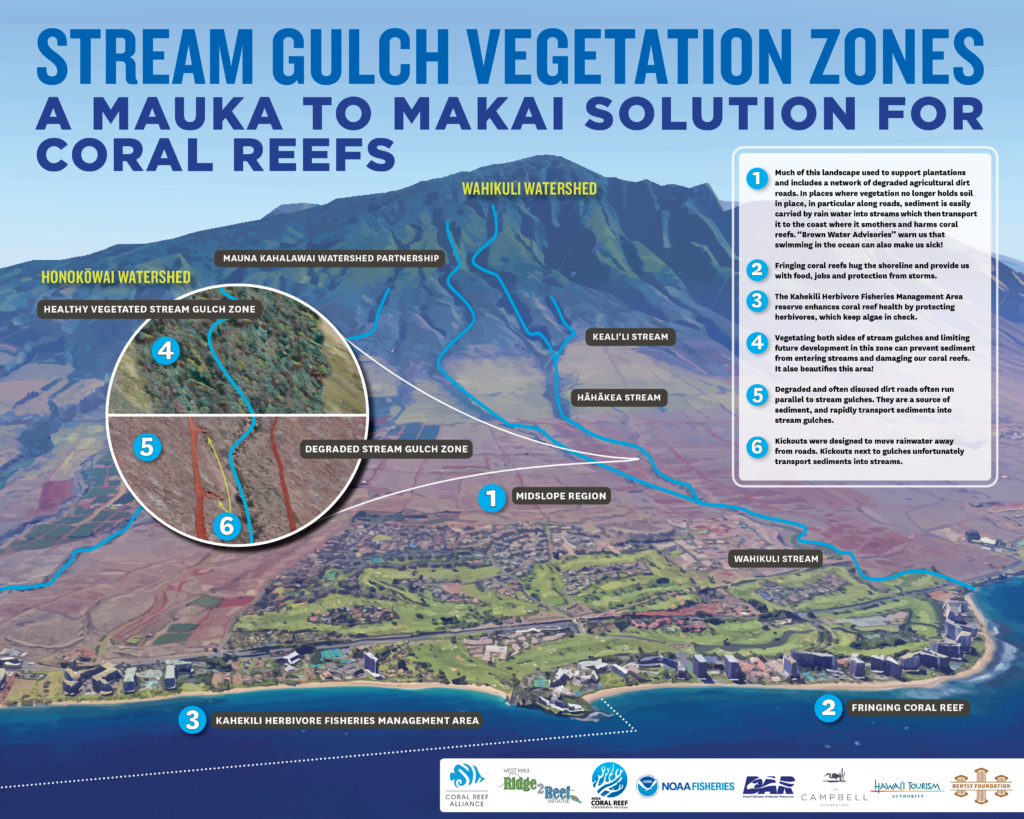 But West Maui is laden with historic sugarcane and pineapple plantations that are now out-of-use. During heavy rain events, the soil from these degraded landscapes travels down old dirt roads, enters stream gulches, and ultimately reaches the ocean where it smothers coral reefs.