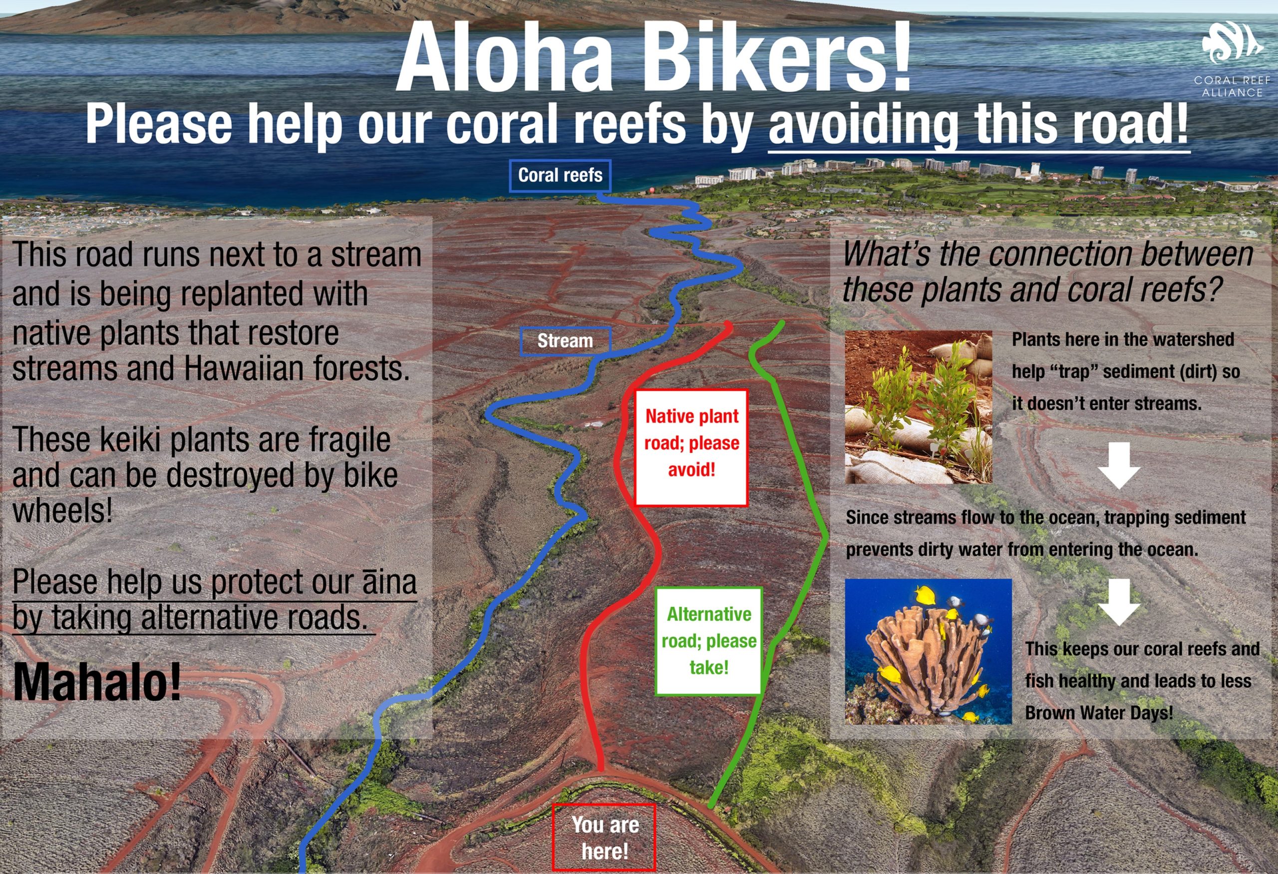 If you walk along a certain dirt road in the Wahikuli watershed in West Maui, you will see a large sign made by the Coral Reef Alliance asking bikers for their kokua (help) in avoiding this road and taking an alternative road nearby instead.