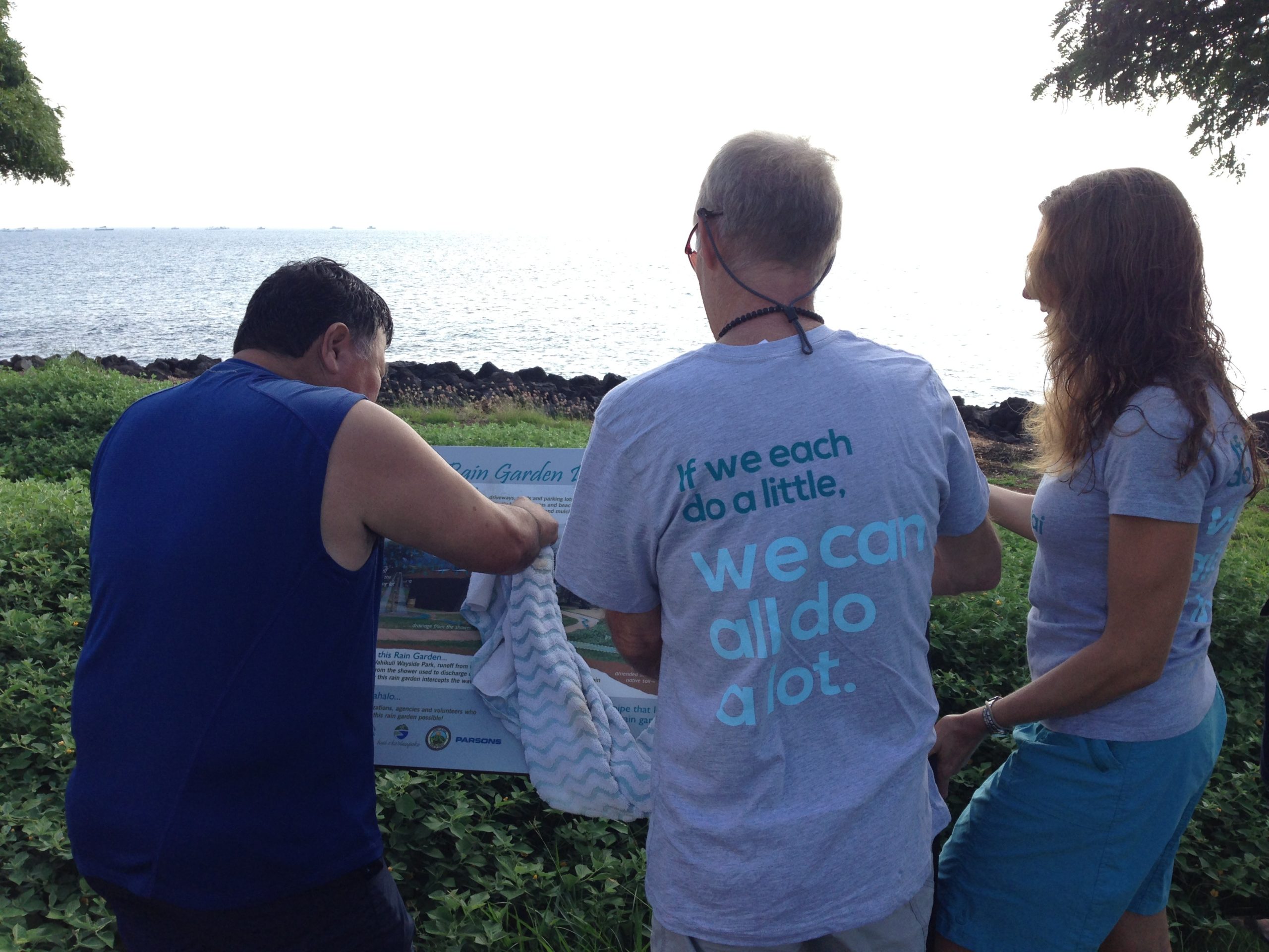 To wrap up the day, we headed over to check out the demonstration rain garden at Wahikuli Wayside Park only to find that our newly installed interpretive sign had been vandalized with graffiti. Mayor Arakawa grabbed a towel from his vehicle and cleaned the sign off, while Tova discussed rain gardens as a “BMP” (Best Management Practice) for reducing land-based pollution. Rain gardens use native plants to filter stormwater on its path to the ocean.