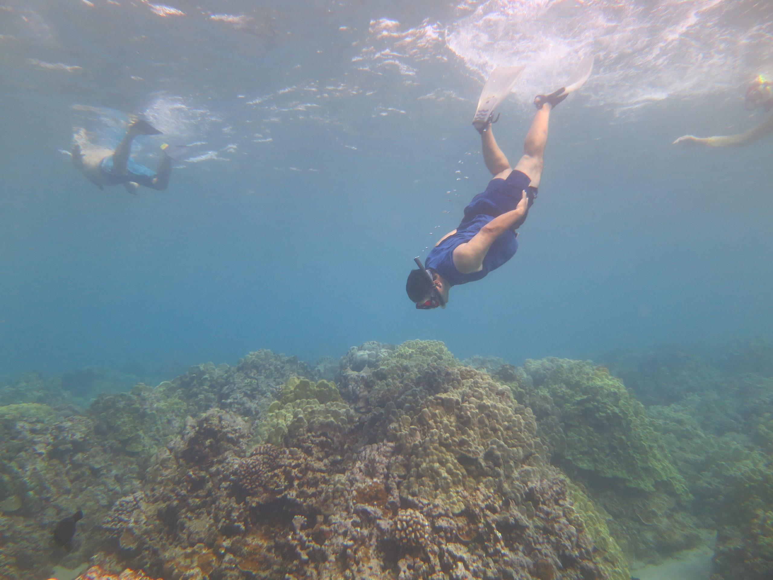 In the water, both the mayor and Rob displayed impressive skills as freedivers, and we were able to look closely at the “points of interest” Darla had discussed earlier. She pointed to things underwater and then we all surfaced to hear her describe them in more detail. She showed us several “dead zones,” where once-thriving finger coral is now a collection of low-lying brown rubble; we also made our way to the “bone yard,” where we could still see the three-dimensional structure of coral that had died recently—a haunting and sad reminder of the reef that once thrived there.